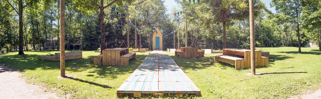 L’aménagement se lit comme une suite d’éléments posés les uns à la suite des autres sur le grand tapis vert que constitue ce vestibule du parc des Evaux. Ces éléments retranscrivent le cycle fermé des nutriments. Au fur et à mesure de votre balade, vous remontez le cycle pour atteindre l’endroit où s’effectue le retour des nutriments au sol: les toilettes sèches.